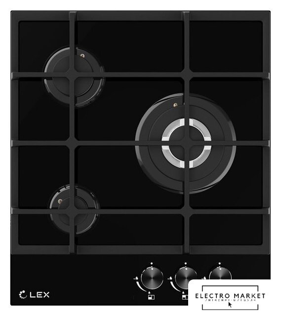 газовая на 3 конфорки, закаленное стекло, мощность: 6400 Вт, автоматический электроподжиг, газ-контроль, решетки: чугун, независимая установка, размеры (ШхГ): 46x52 см