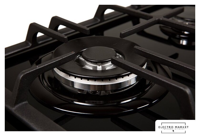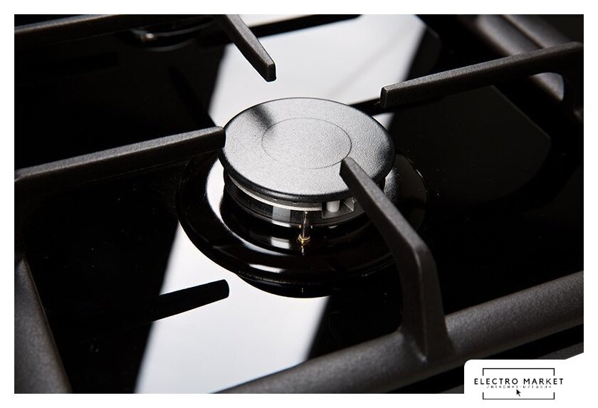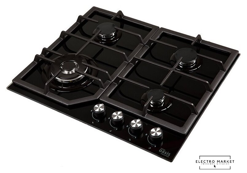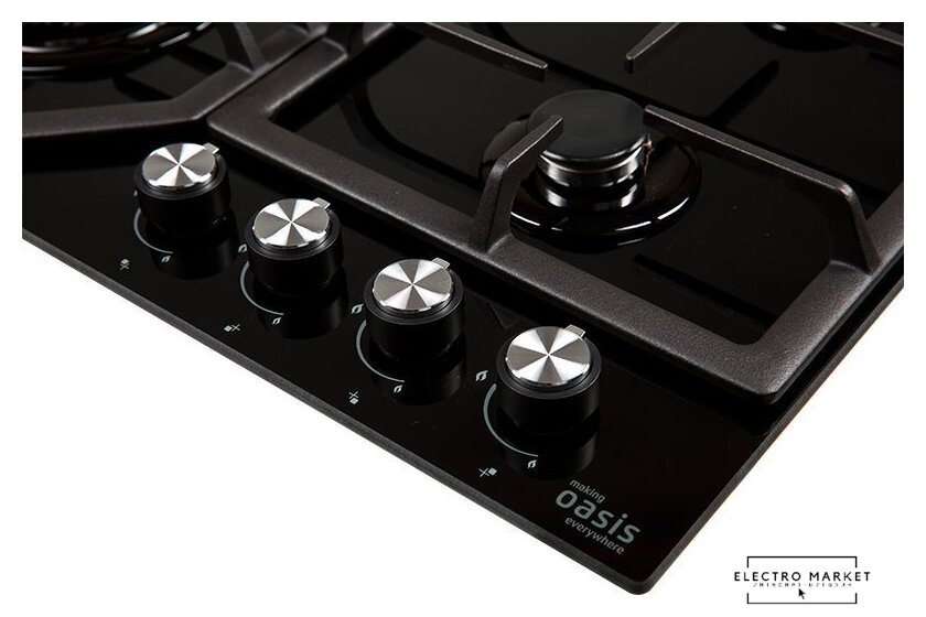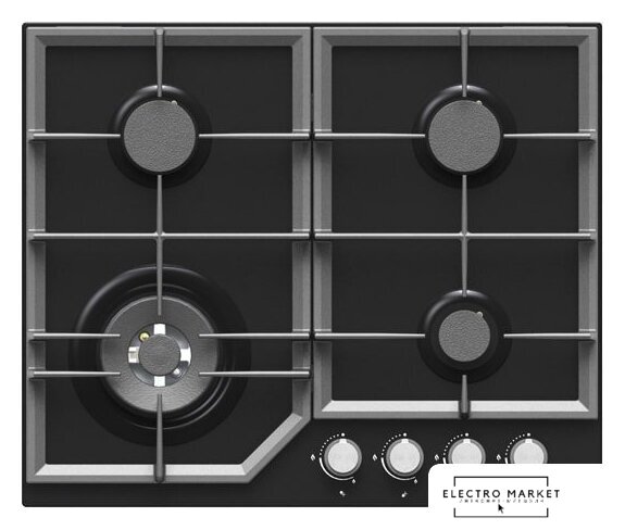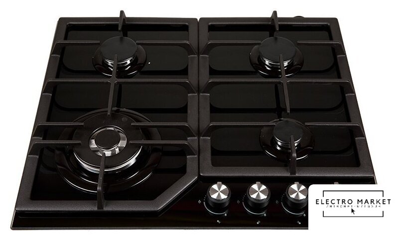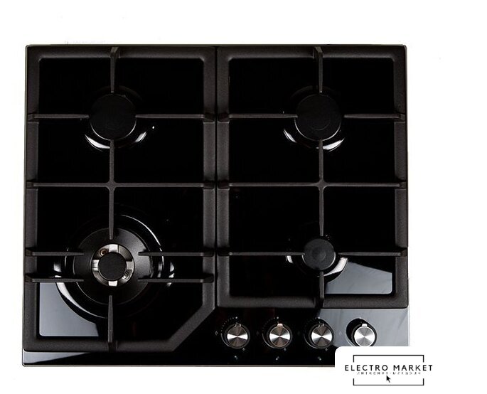 газовая на 4 конфорки, закаленное стекло, мощность: 8300 Вт, автоматический электроподжиг, газ-контроль, решетки: чугун, размеры (ШхГ): 60x52 см