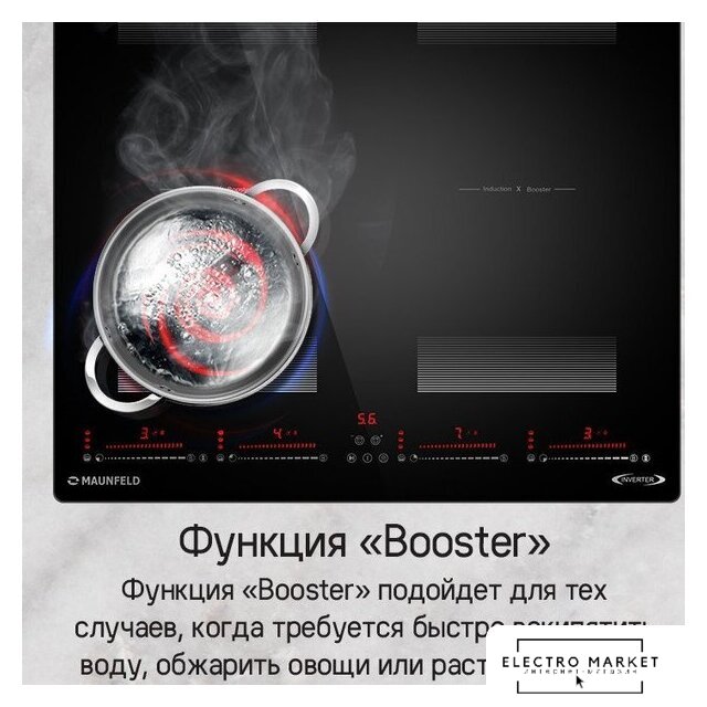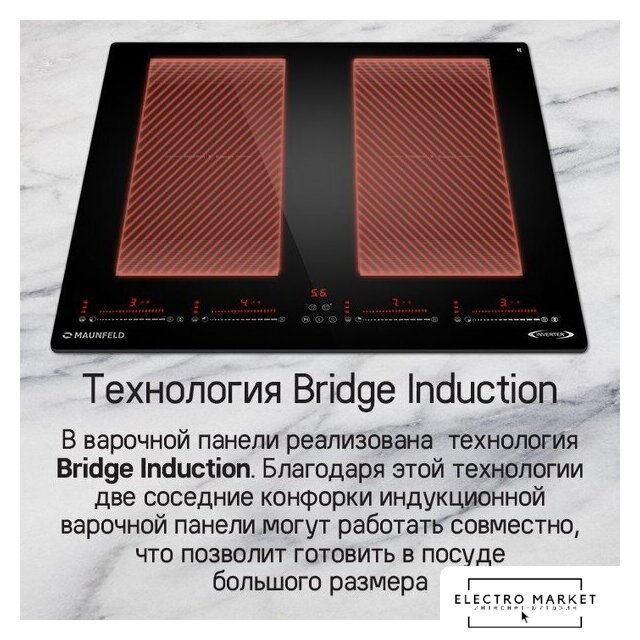 Подробная информация о конфорках | Диаметр конфорок, мм 190x190Мощность конфорок 2х2000 (бустер 2800 ), 2х1500 (бустер 2000) |
