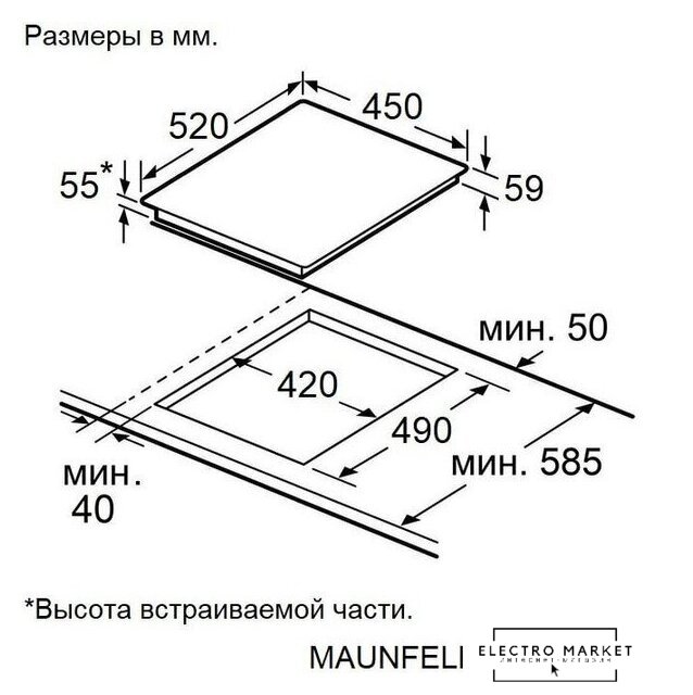 индукционная на 3 конфорки, cтеклокерамика, мощность: 6200 Вт, независимая установка, размеры (ШхГ): 45x52 см