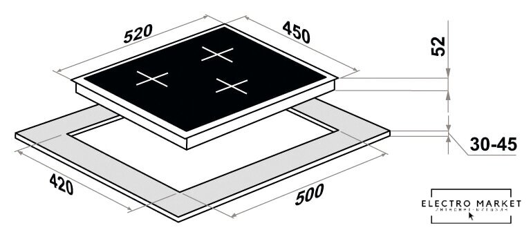 HiLight на 3 конфорки, cтеклокерамика, мощность: 5000 Вт, независимая установка, размеры (ШхГ): 45x51 см