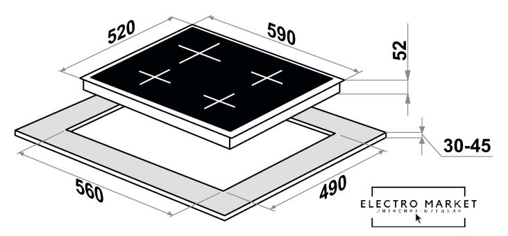 HiLight на 4 конфорки, cтеклокерамика, мощность: 6200 Вт, независимая установка, размеры (ШхГ): 59x52 см