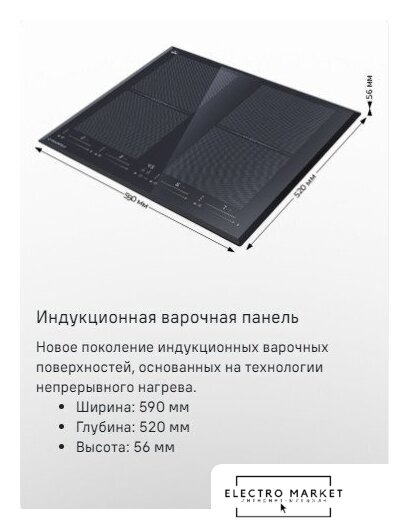 индукционная на 4 конфорки, cтеклокерамика, мощность: 7400 Вт, независимая установка, размеры (ШхГ): 59x52 см