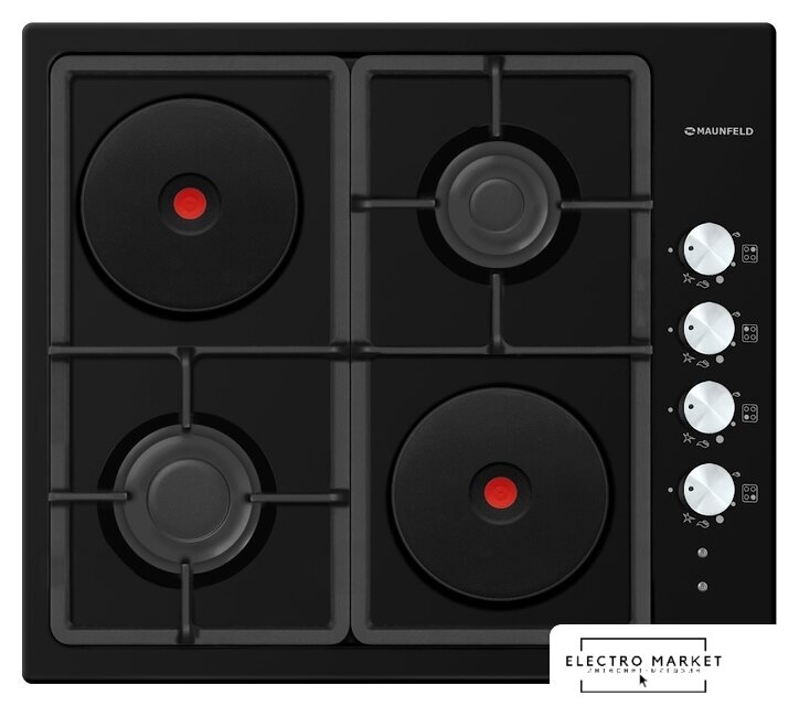 газ+электро на 4 конфорки, нержавеющая сталь, автоматический электроподжиг, газ-контроль, решетки: чугун, независимая установка, размеры (ШхГ): 59x52 см