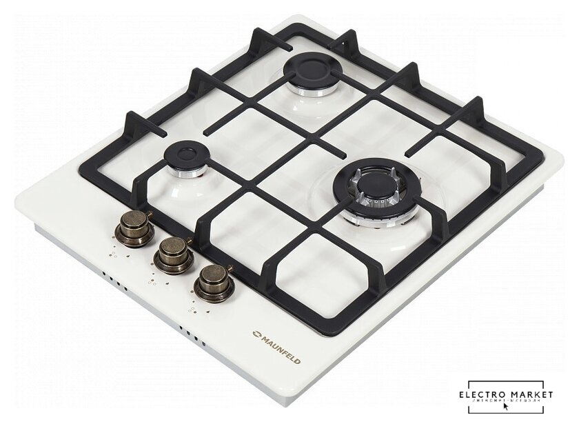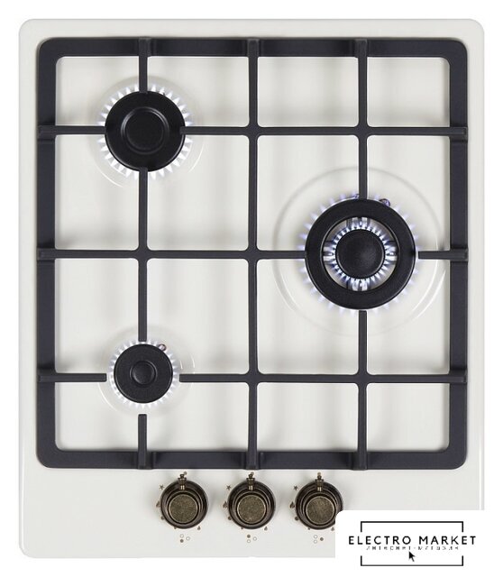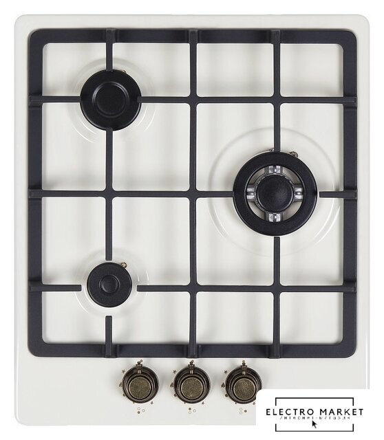 газовая на 3 конфорки, закаленное стекло, мощность: 5700 Вт, автоматический электроподжиг, газ-контроль, решетки: чугун, независимая установка, размеры (ШхГ): 44x51 см