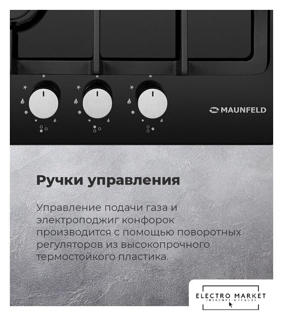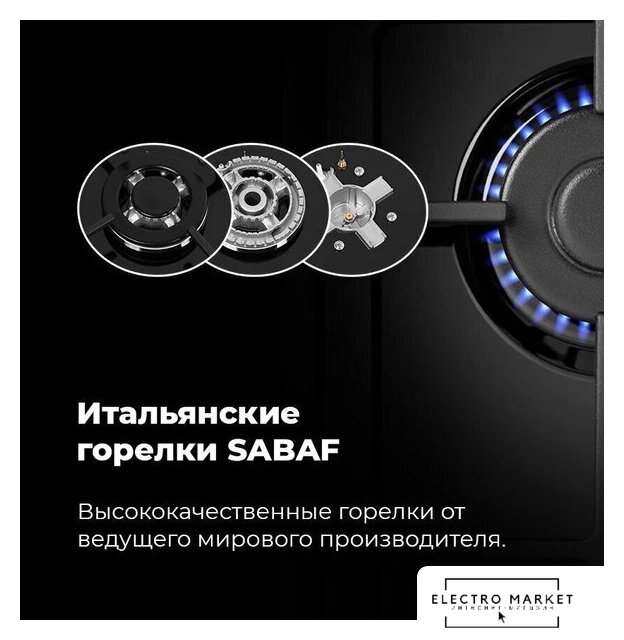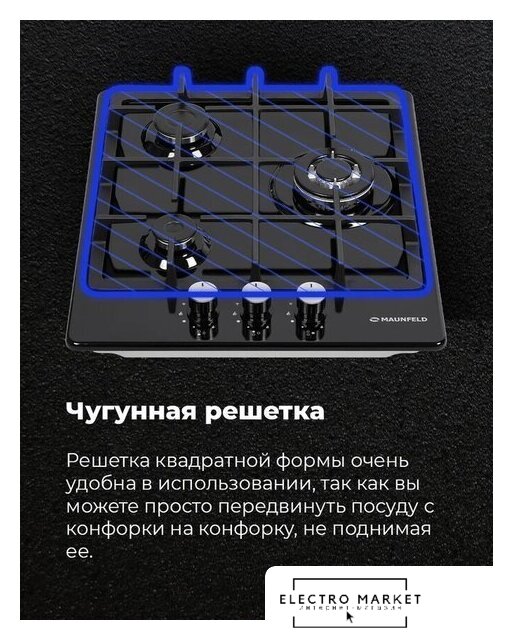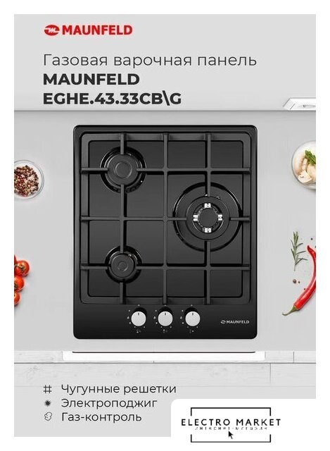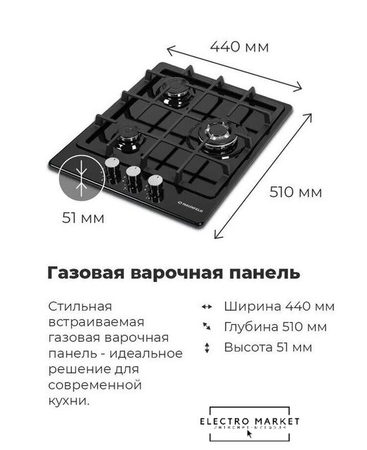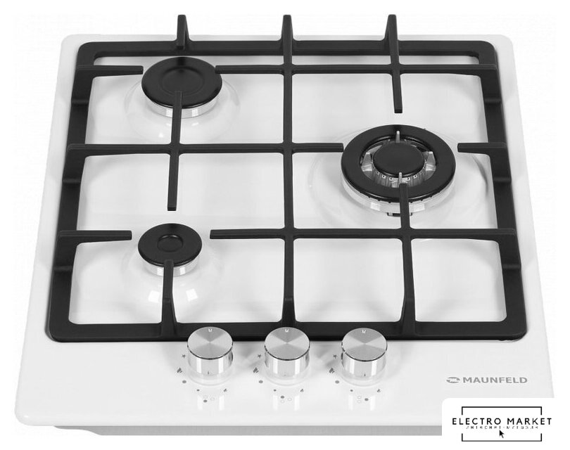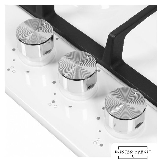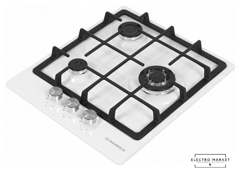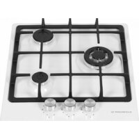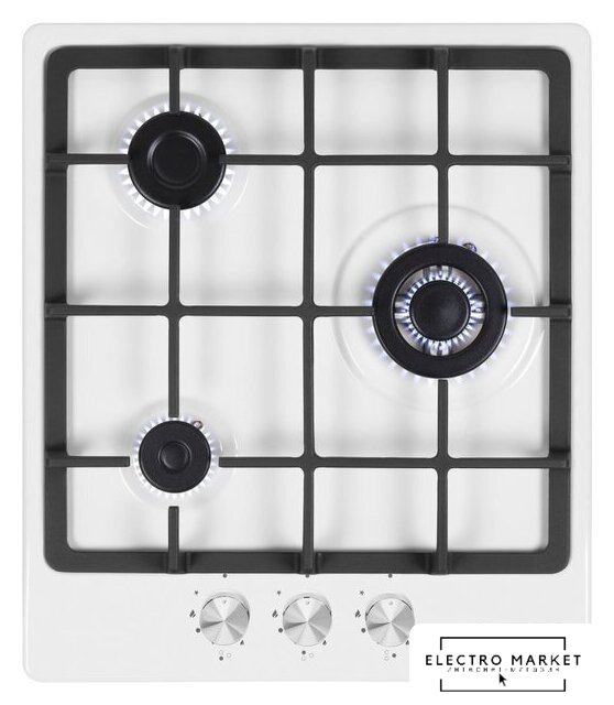 газовая на 3 конфорки, закаленное стекло, мощность: 6400 Вт, автоматический электроподжиг, газ-контроль, решетки: чугун, размеры (ШхГ): 44x51 см