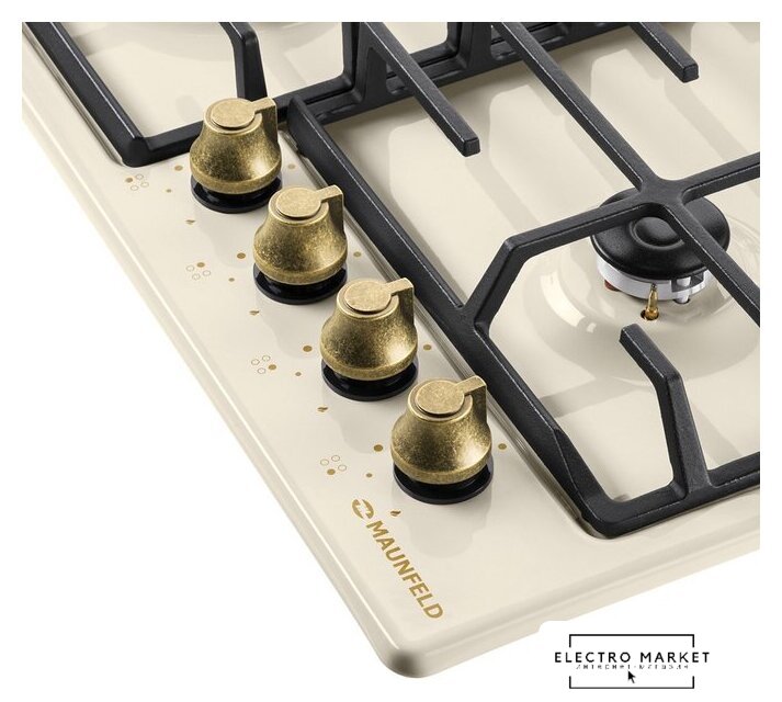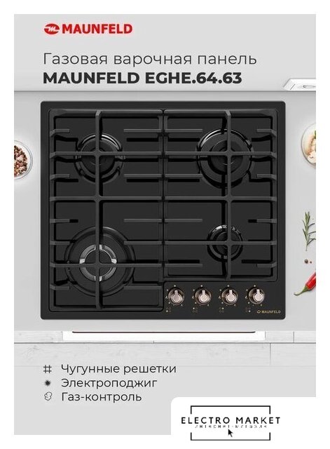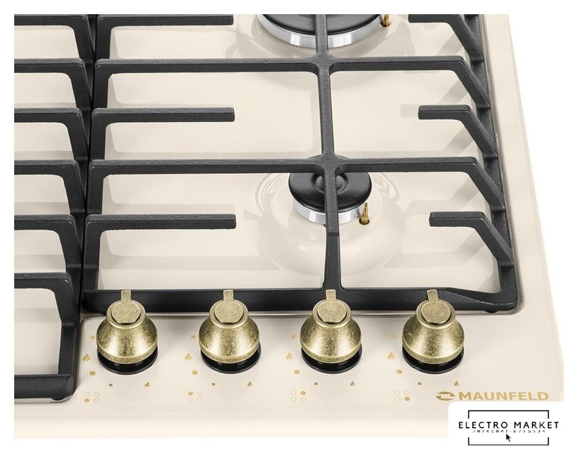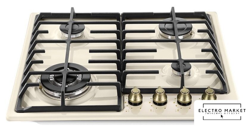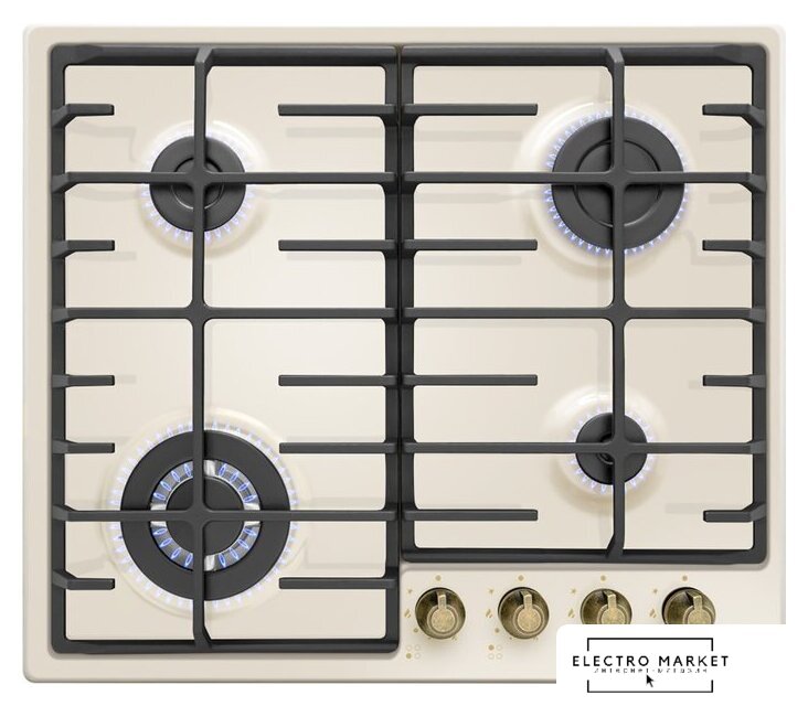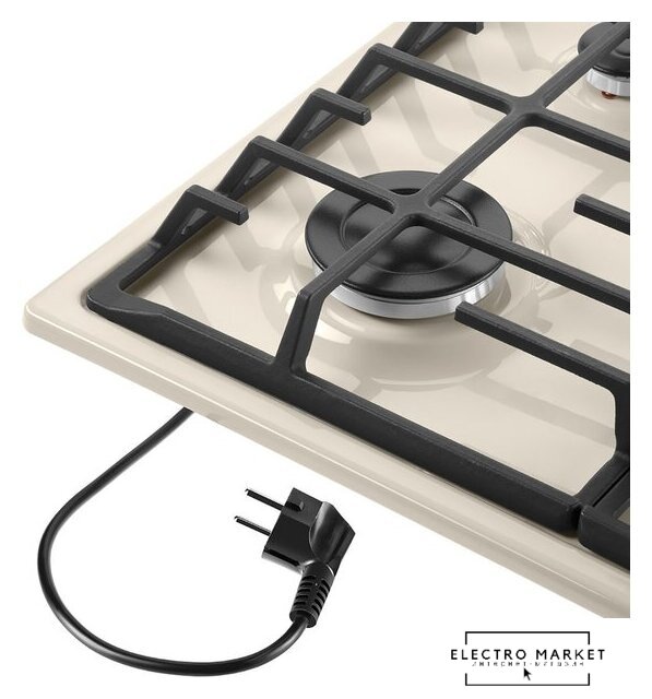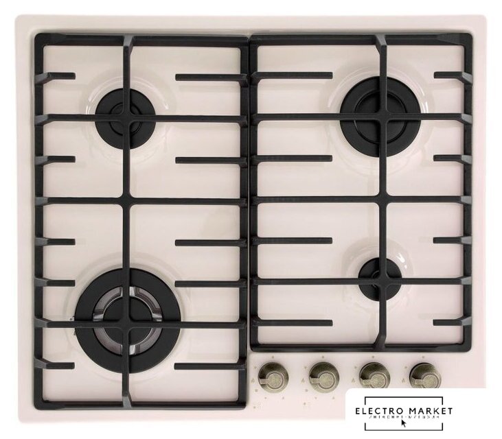 газовая на 4 конфорки, закаленное стекло, мощность: 8300 Вт, автоматический электроподжиг, газ-контроль, решетки: чугун