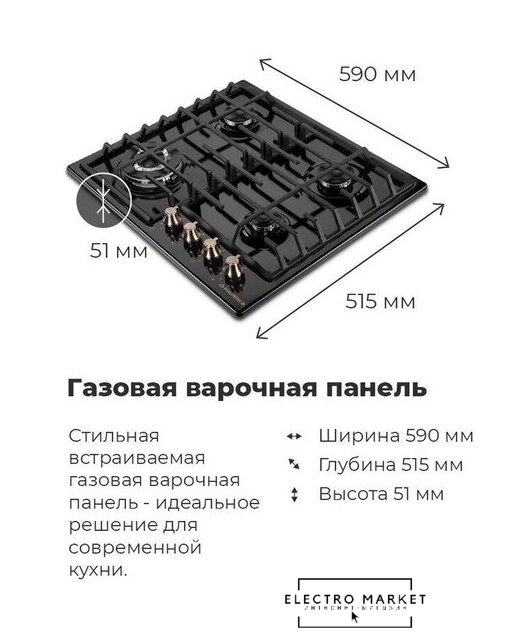 газовая на 4 конфорки, закаленное стекло, мощность: 7400 Вт, автоматический электроподжиг, газ-контроль, решетки: чугун, независимая установка, размеры (ШхГ): 59x52 см