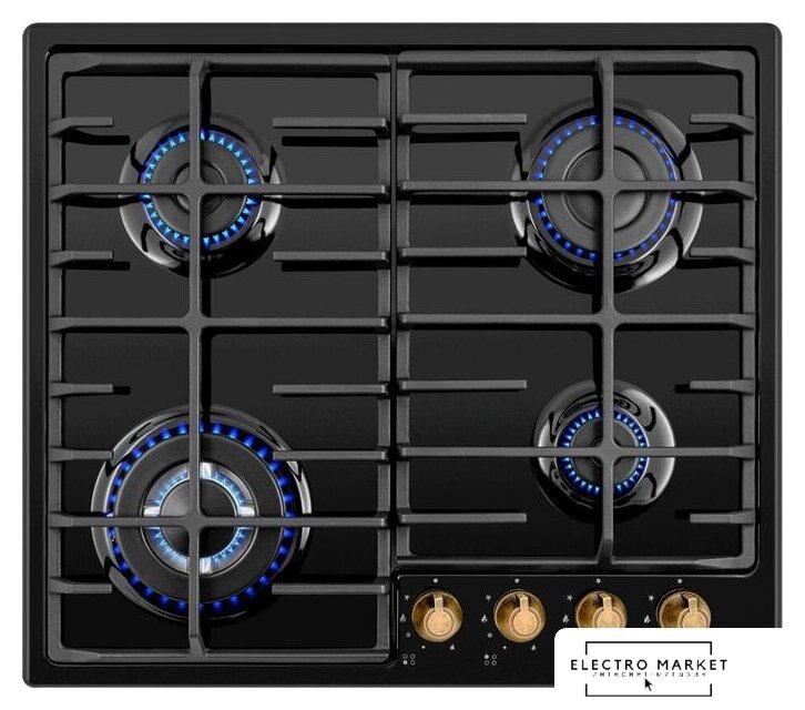 газовая на 4 конфорки, закаленное стекло, мощность: 8300 Вт, автоматический электроподжиг, газ-контроль, решетки: чугун