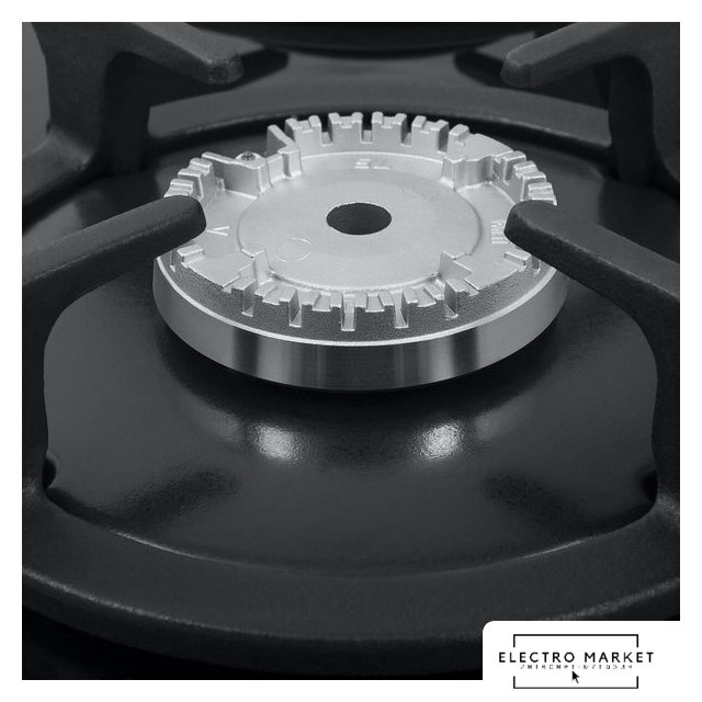газовая на 4 конфорки, закаленное стекло, мощность: 8650 Вт, автоматический электроподжиг, газ-контроль, решетки: чугун