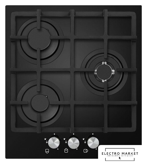 газовая на 3 конфорки, закаленное стекло, мощность: 6400 Вт, автоматический электроподжиг, газ-контроль, решетки: чугун, независимая установка, размеры (ШхГ): 54x54 см