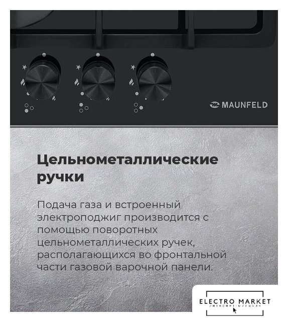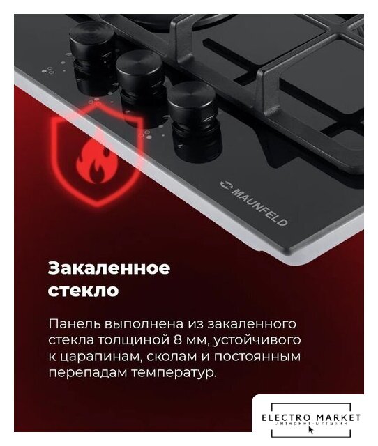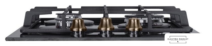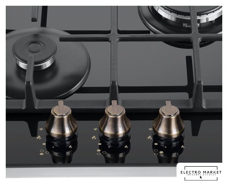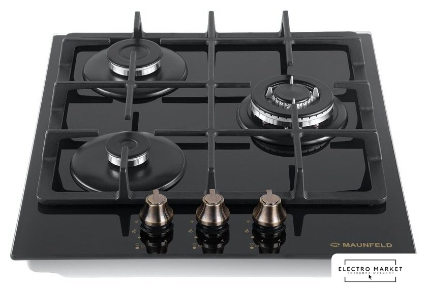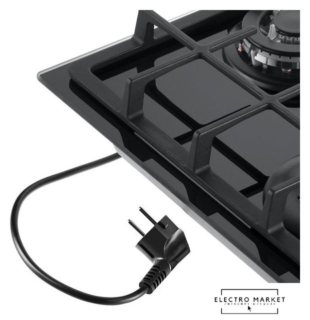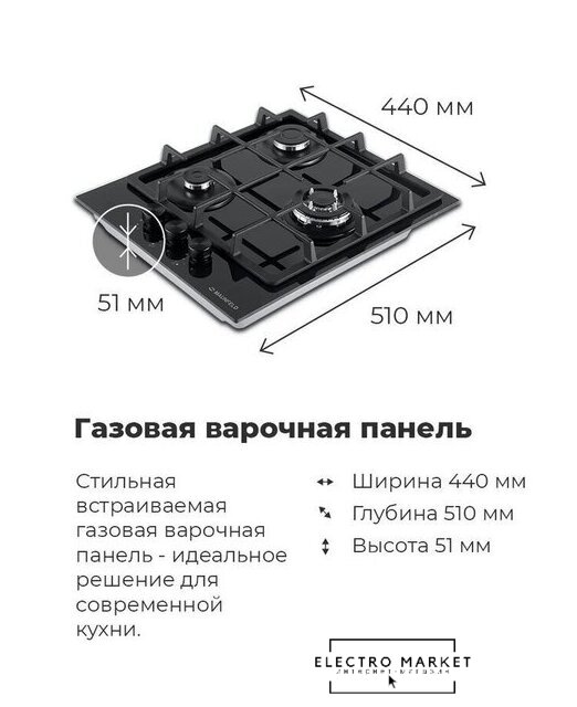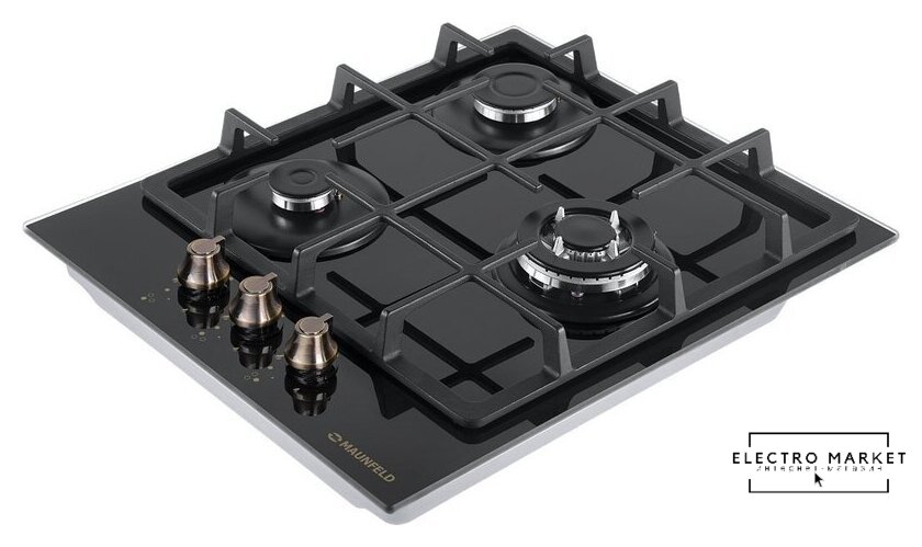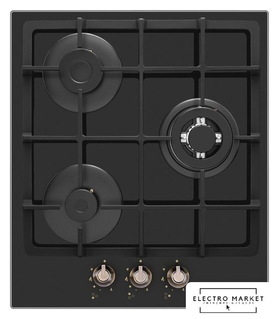 газовая на 3 конфорки, закаленное стекло, мощность: 5700 Вт, автоматический электроподжиг, газ-контроль, решетки: чугун, независимая установка, размеры (ШхГ): 44x51 см