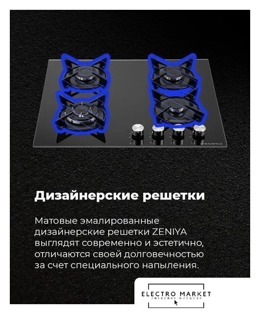 эмалированная сталь, мощность: 7650 Вт, автоматический электроподжиг, газ-контроль, независимая установка, размеры (ШхГ): 60x52 см