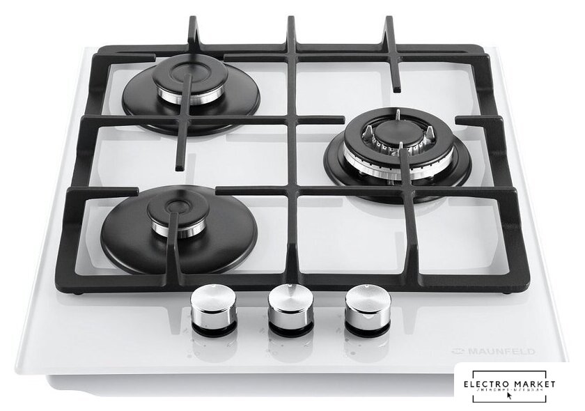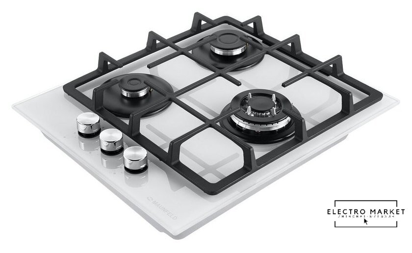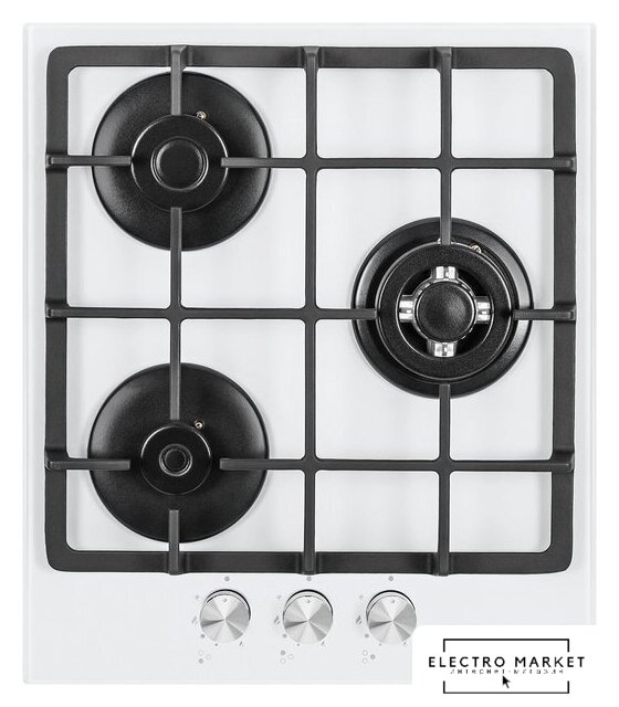 газовая на 3 конфорки, закаленное стекло, мощность: 5700 Вт, газ-контроль, решетки: чугун, независимая установка, размеры (ШхГ): 44x51 см