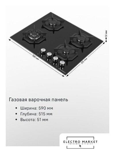 газовая на 4 конфорки, закаленное стекло, мощность: 7000 Вт, автоматический электроподжиг, газ-контроль, решетки: чугун, независимая установка, размеры (ШхГ): 59x51.5 см