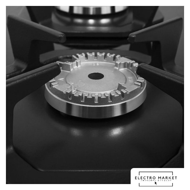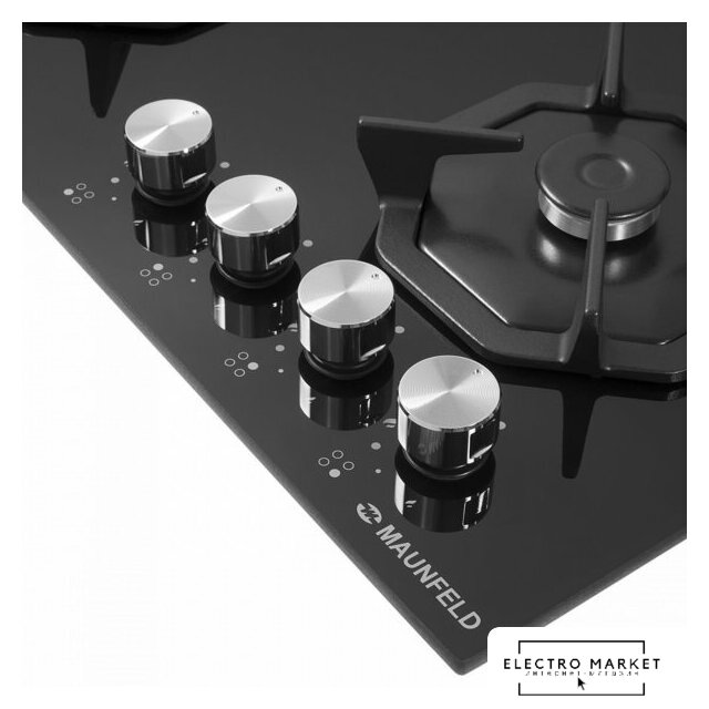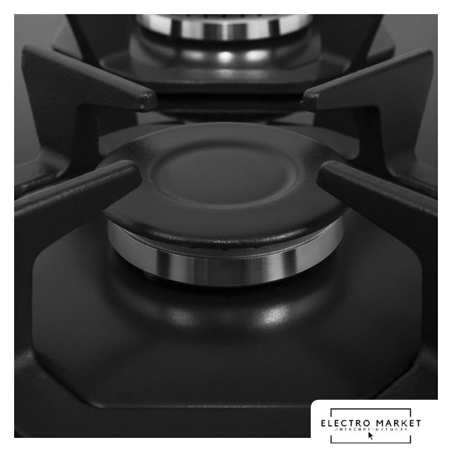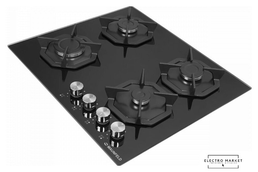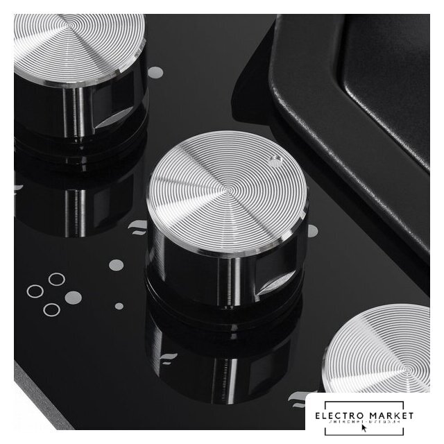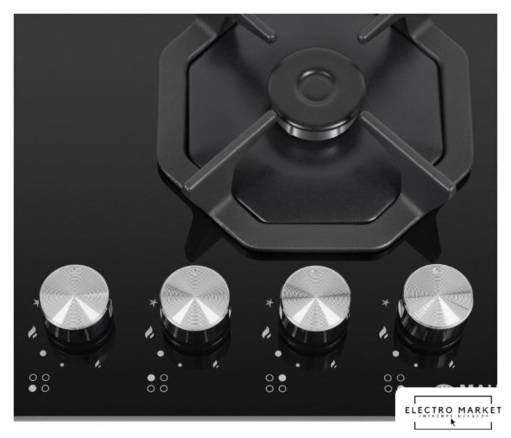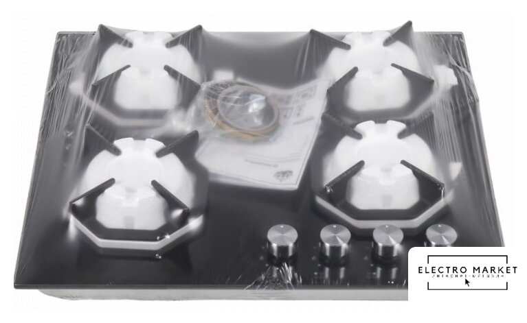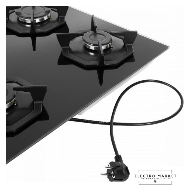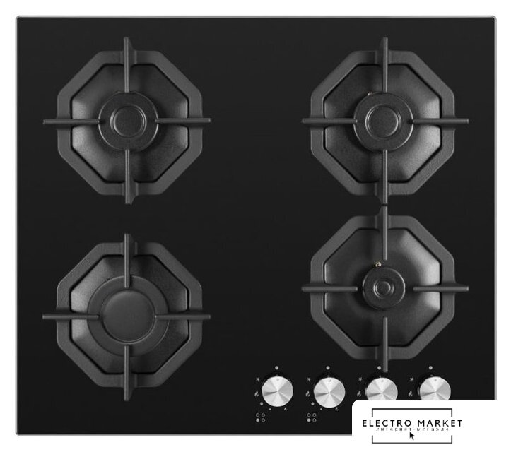 газовая на 4 конфорки, закаленное стекло, мощность: 7500 Вт, автоматический электроподжиг, газ-контроль, решетки: чугун