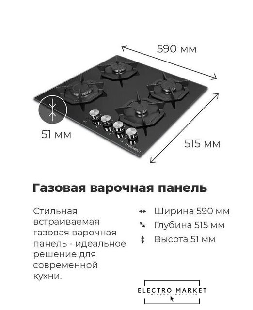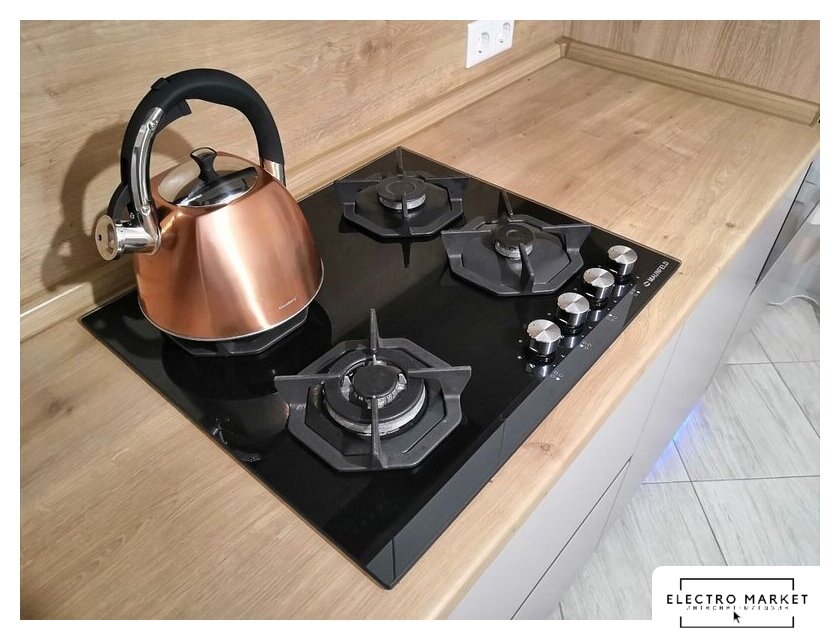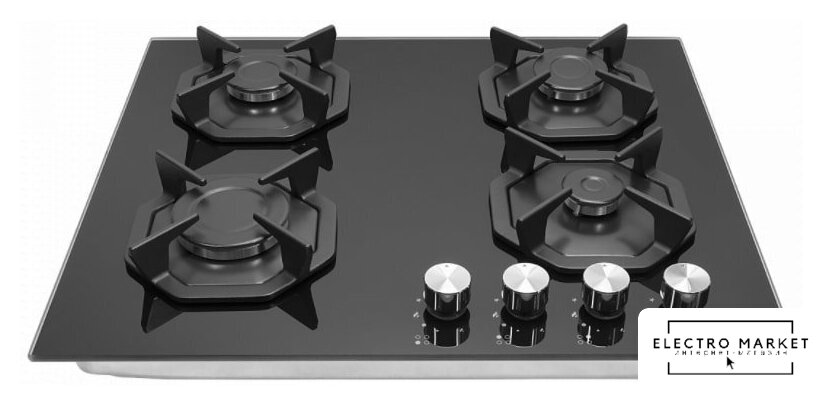 газовая на 4 конфорки, закаленное стекло, мощность: 8000 Вт, автоматический электроподжиг, газ-контроль, решетки: чугун, размеры (ШхГ): 58.4x51 см