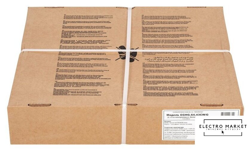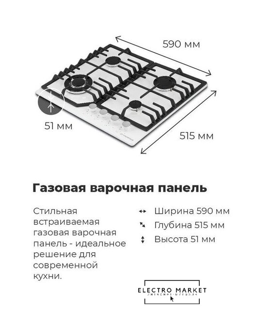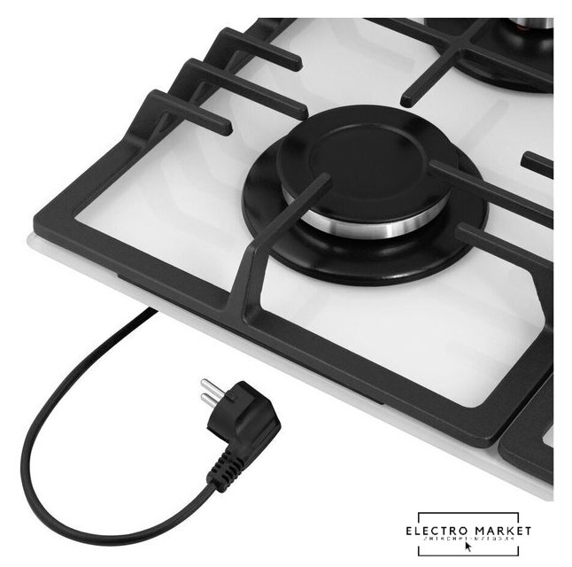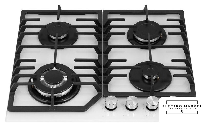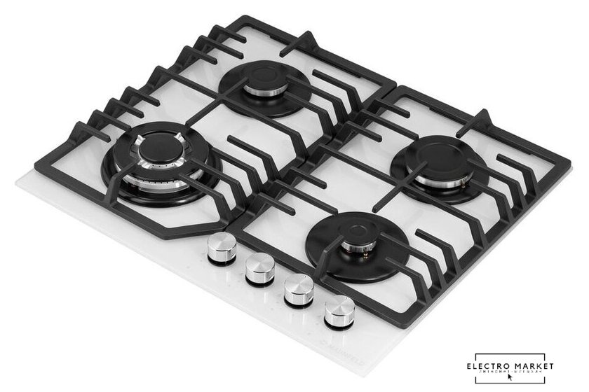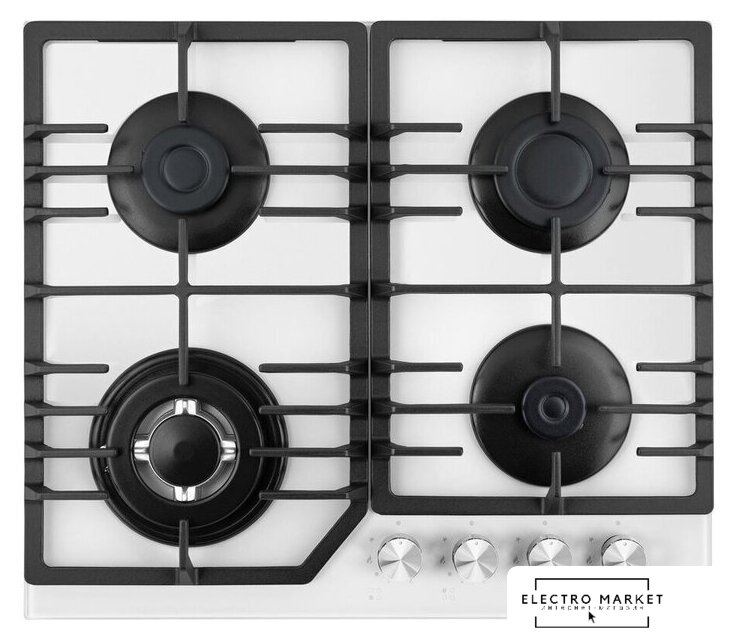 газовая на 4 конфорки, закаленное стекло, мощность: 7450 Вт, автоматический электроподжиг, газ-контроль, решетки: чугун, независимая установка, размеры (ШхГ): 59x52 см