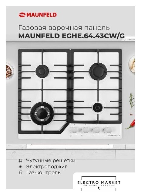 газовая на 5 конфорок, эмалированная сталь, мощность: 10460 Вт, автоматический электроподжиг, газ-контроль, решетки: чугун, независимая установка, размеры (ШхГ): 68x50 см