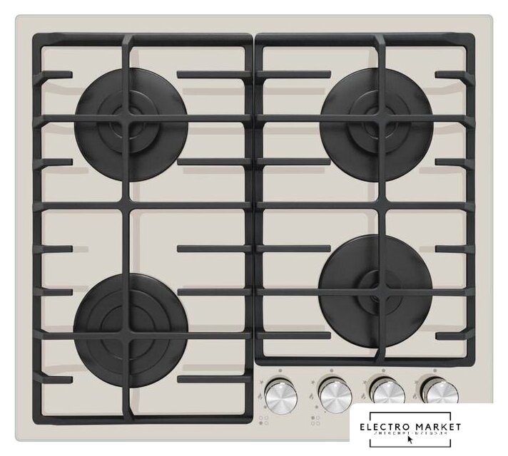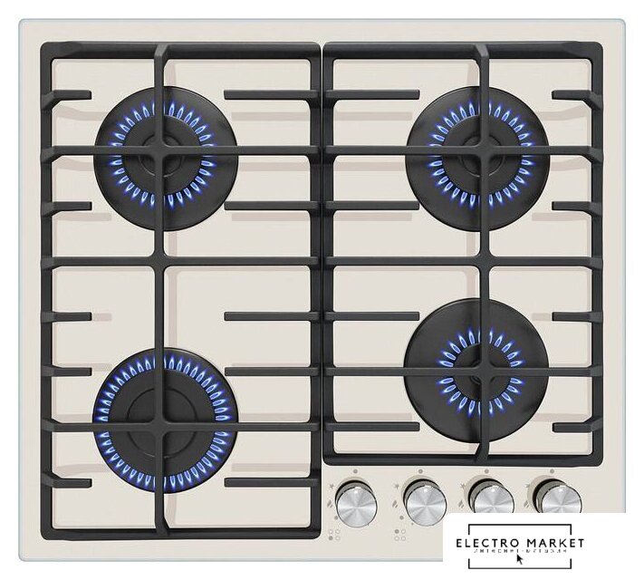 газовая на 4 конфорки, закаленное стекло, мощность: 8300 Вт, автоматический электроподжиг, газ-контроль, решетки: чугун