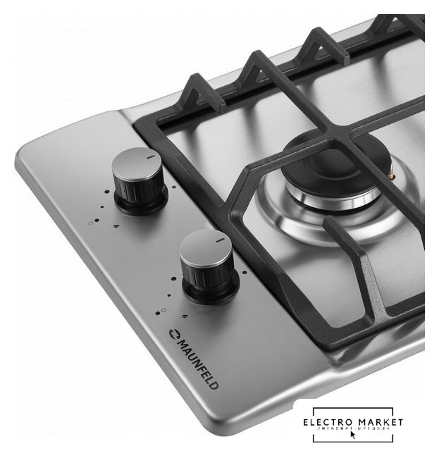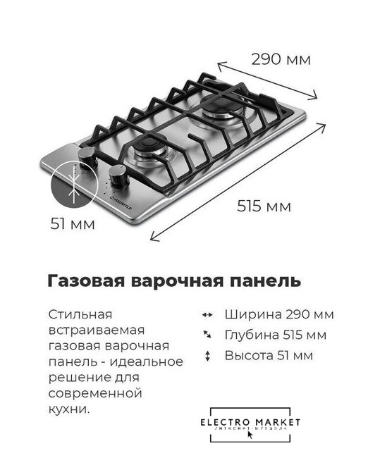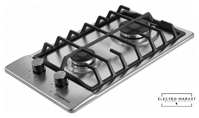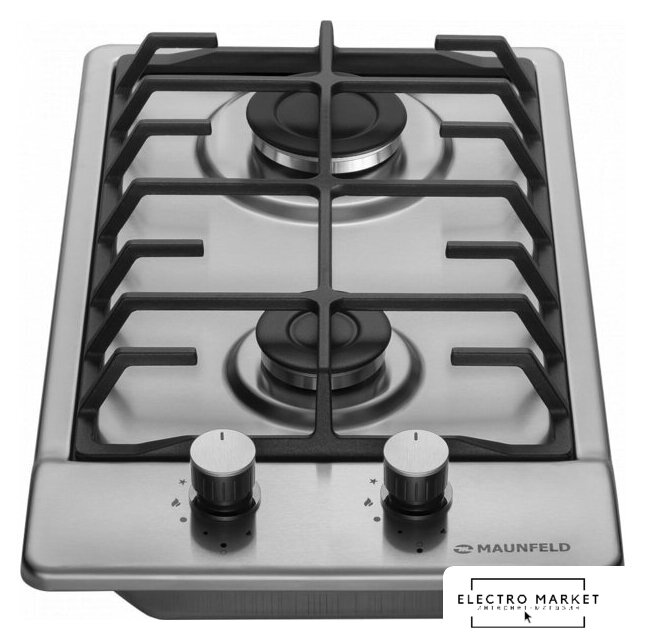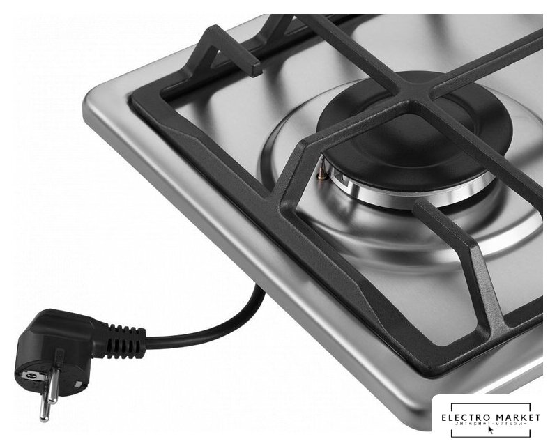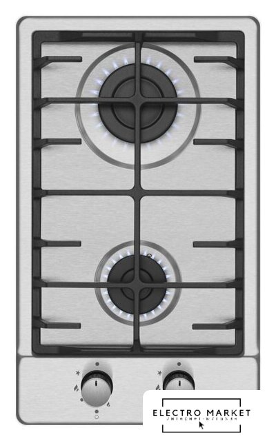 газовая на 2 конфорки, нержавеющая сталь, мощность: 3900 Вт, автоматический электроподжиг, газ-контроль, решетки: чугун, независимая установка, размеры (ШхГ): 29x51 см
