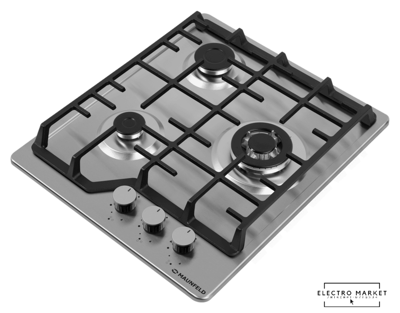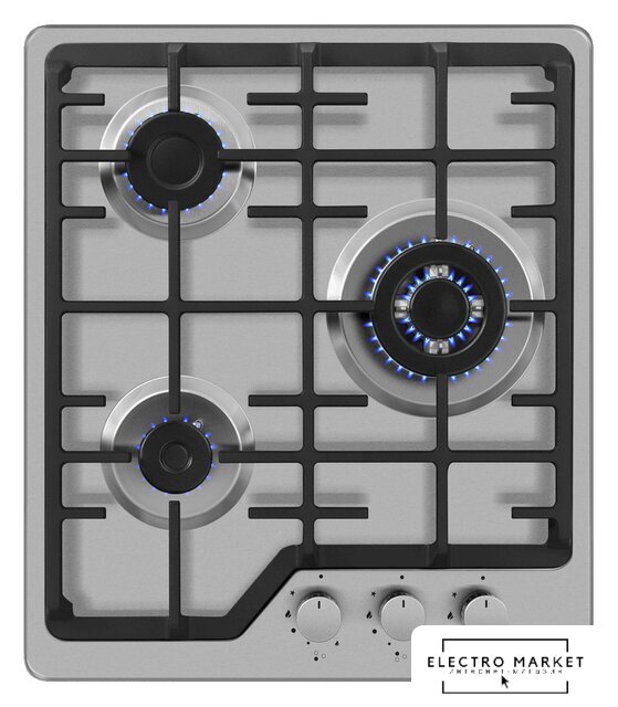газовая на 3 конфорки, закаленное стекло, мощность: 6200 Вт, автоматический электроподжиг, газ-контроль, решетки: чугун, независимая установка, размеры (ШхГ): 45x51 см