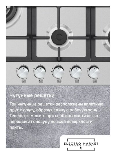 газовая на 5 конфорок, нержавеющая сталь, мощность: 10800 Вт, автоматический электроподжиг, газ-контроль, решетки: чугун, независимая установка, размеры (ШхГ): 86x51.5 см