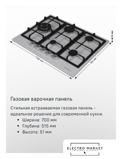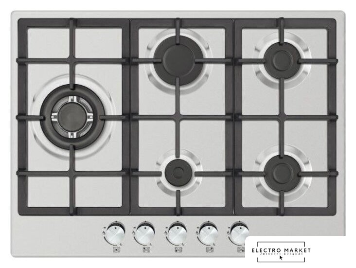газовая на 5 конфорок, закаленное стекло, мощность: 11000 Вт, автоматический электроподжиг, газ-контроль, решетки: чугун, независимая установка, размеры (ШхГ): 70x51 см