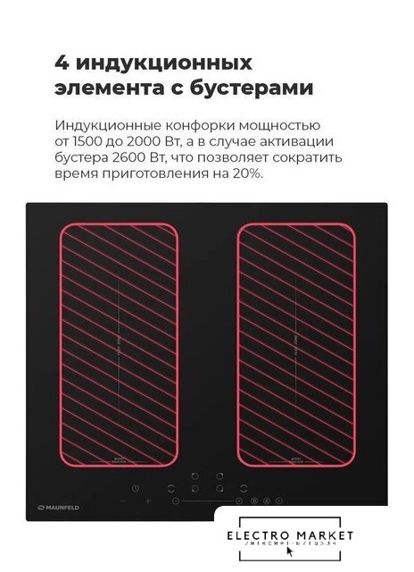 Подробная информация о конфорках | мощность каждого моста при объединение конфорок 2600/3000 (бустер)верхняя левая 1500/ 2000 (бустер)нижняя левая 2000/2600 (бустер)верхняя правая 2000/2600(бустер)нижняя правая 1500/2000 (бустер) |