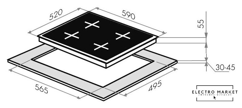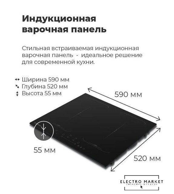 индукционная на 4 конфорки, cтеклокерамика, мощность: 7400 Вт, независимая установка, размеры (ШхГ): 59.5x52.5 см