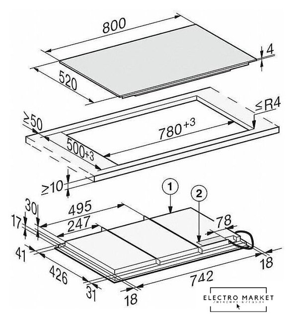 индукционная на 4 конфорки, cтеклокерамика, мощность: 7400 Вт, независимая установка, размеры (ШхГ): 83x52 см