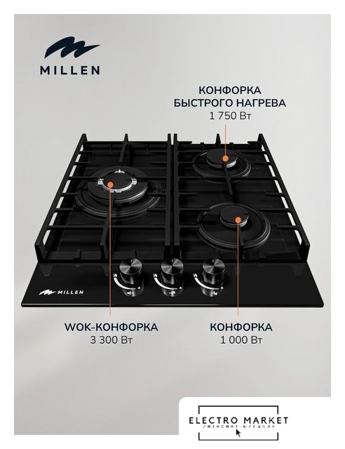 | Подробная информация о конфорках | WOK-конфорка 1х3300 Вт, конфорка быстрого нагрева 1х1750 Вт, дополнительная конфорка 1х1000 Вт |