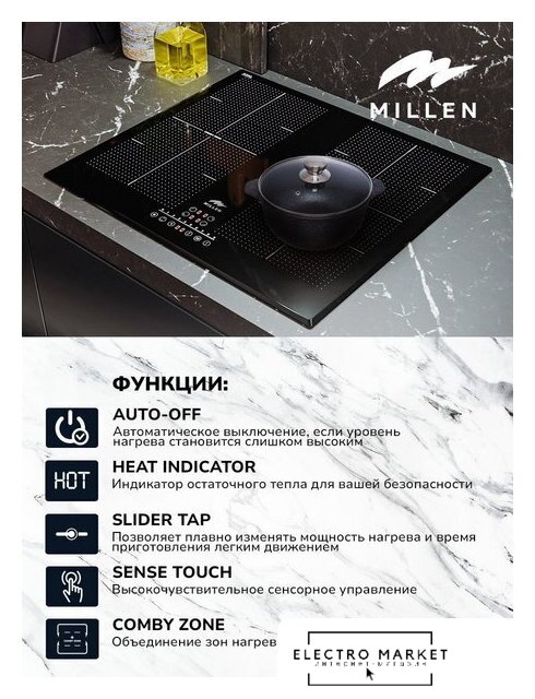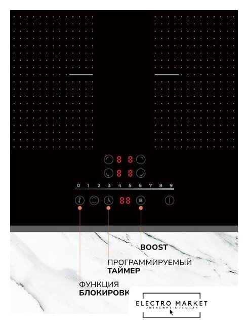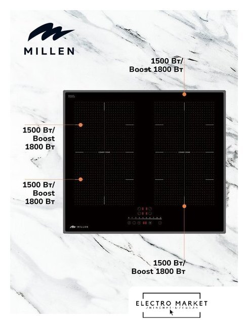 | Подробная информация о конфорках | Всего 4 индукционные зоны нагрева, две из которых могут объединяться в Comby zone. Мощность зон 2 x 3000 Вт, при активации Boost - до 3400 Вт. |