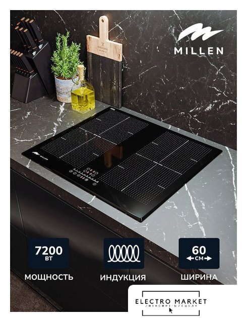 индукционная на 4 конфорки, cтеклокерамика, мощность: 7200 Вт, независимая установка, размеры (ШхГ): 60x52 см