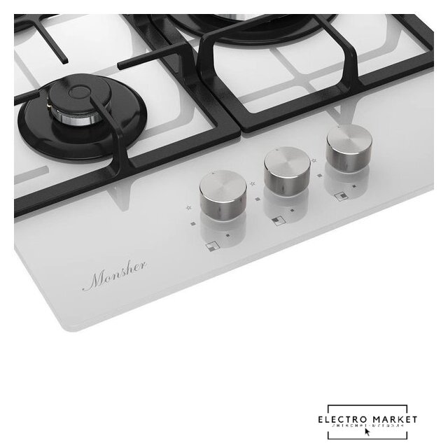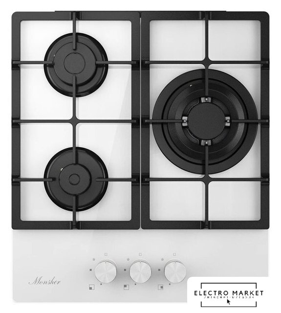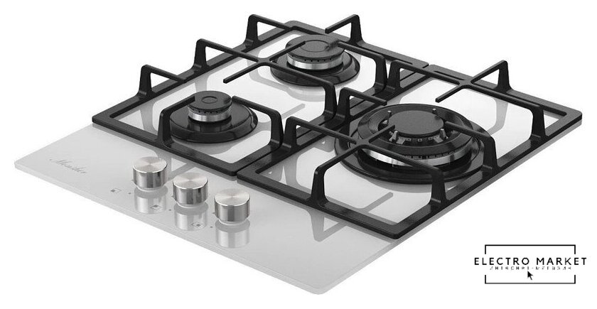 газовая на 3 конфорки, закаленное стекло, мощность: 6400 Вт, автоматический электроподжиг, газ-контроль, решетки: чугун, независимая установка, размеры (ШхГ): 46x52 см