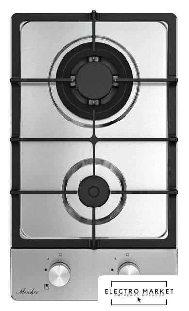 газовая на 2 конфорки, закаленное стекло, мощность: 5550 Вт, автоматический электроподжиг, газ-контроль, решетки: чугун, независимая установка, размеры (ШхГ): 30.3x52 см