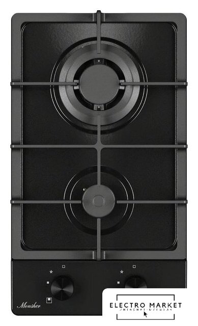 газовая на 2 конфорки, закаленное стекло, мощность: 5550 Вт, автоматический электроподжиг, газ-контроль, решетки: чугун, независимая установка, размеры (ШхГ): 30.3x52 см