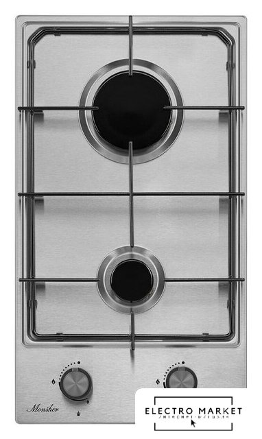 газовая на 2 конфорки, нержавеющая сталь, мощность: 4300 Вт, автоматический электроподжиг, газ-контроль, решетки: чугун, независимая установка, размеры (ШхГ): 29x51.5 см
