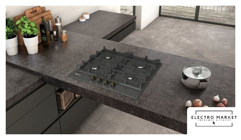 газовая на 4 конфорки, закаленное стекло, мощность: 7400 Вт, автоматический электроподжиг, газ-контроль, решетки: чугун, независимая установка, размеры (ШхГ): 59x52 см