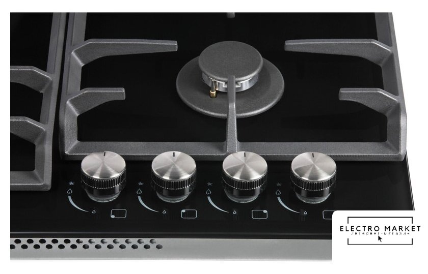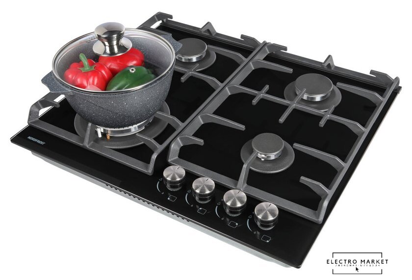 газовая на 4 конфорки, закаленное стекло, автоматический электроподжиг, газ-контроль, решетки: чугун, независимая установка, размеры (ШхГ): 67x52.5 см
