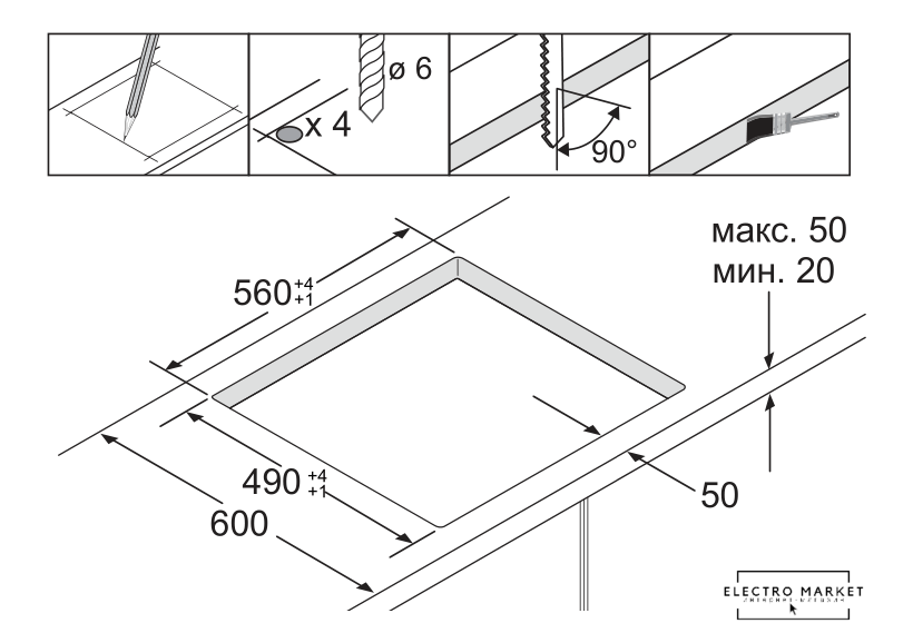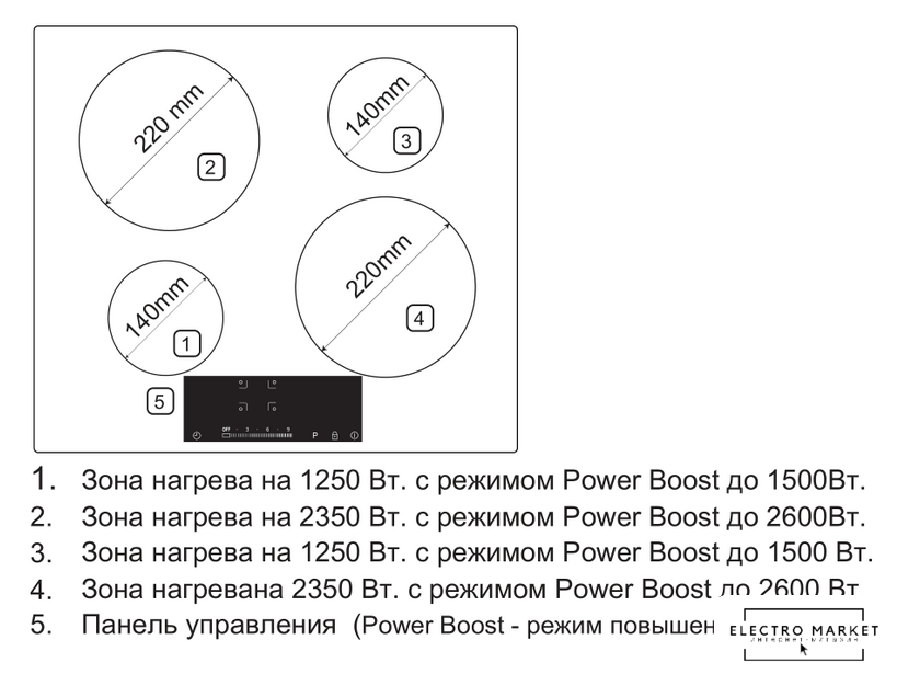 индукционная на 4 конфорки, cтеклокерамика, независимая установка, размеры (ШхГ): 59x52 см