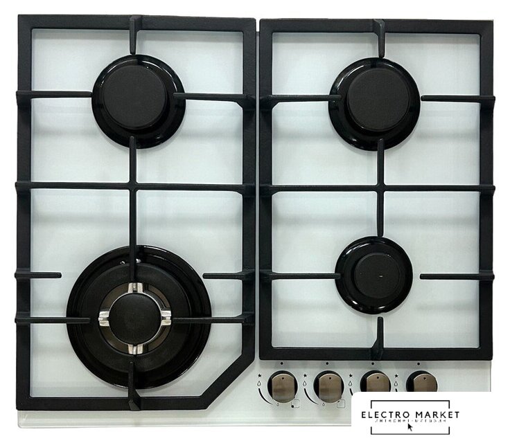 газовая на 4 конфорки, закаленное стекло, мощность: 8150 Вт, автоматический электроподжиг, газ-контроль, решетки: чугун, независимая установка, размеры (ШхГ): 58.5x51 см