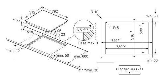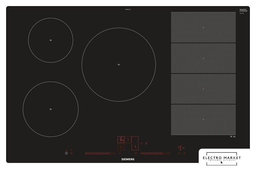 Подробная информация о конфорках | 1 x 180 мм, 1,8/3,1 кВт; 1 x 145 мм, 1,4/2,2 кВт;1 х 240 мм, 2,2/3,7 кВт; 2 x 200 мм, 2,2 кВт/3,7 кВт (1 x 400x200 мм, 3,3/3,7 кВт ) |