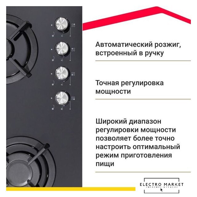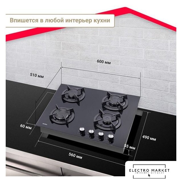 газовая на 4 конфорки, закаленное стекло, мощность: 7500 Вт, автоматический электроподжиг, газ-контроль, решетки: чугун, независимая установка, размеры (ШхГ): 60x51 см