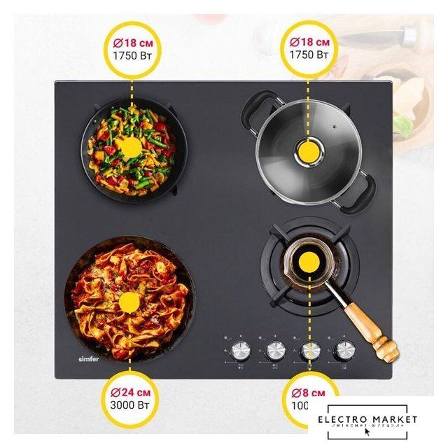 Подробная информация о конфорках | 3000 Вт1750 Вт1750 Вт1000 Вт |