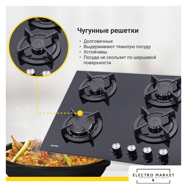 газовая на 4 конфорки, закаленное стекло, мощность: 7800 Вт, автоматический электроподжиг, газ-контроль, решетки: чугун, независимая установка, размеры (ШхГ): 59x50 см