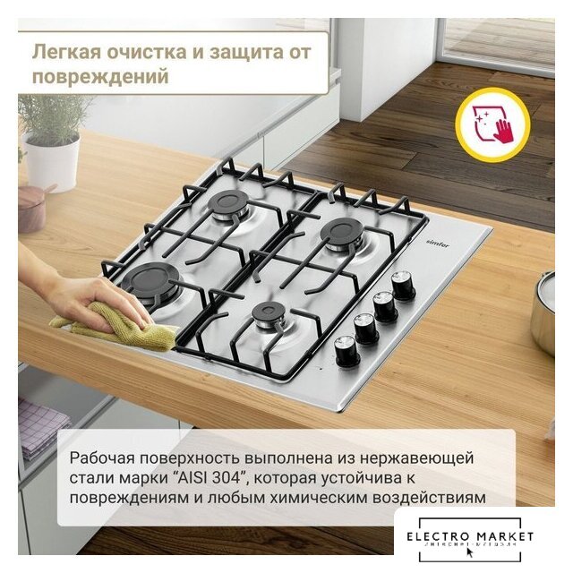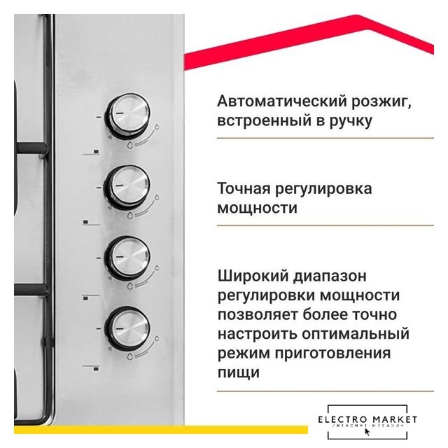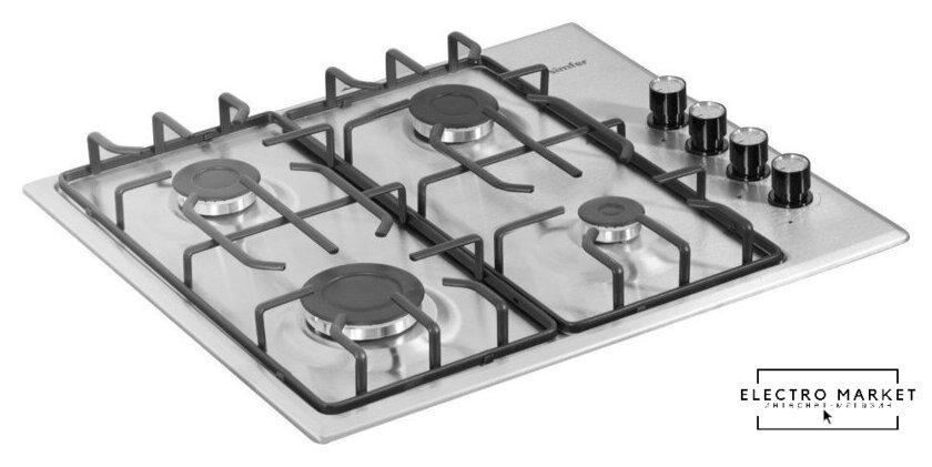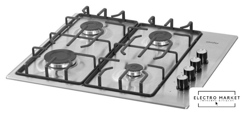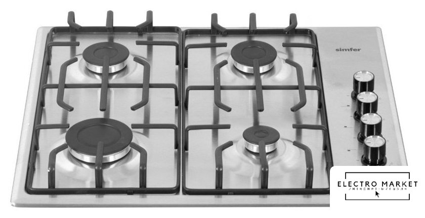 газовая на 4 конфорки, нержавеющая сталь, мощность: 8000 Вт, автоматический электроподжиг, решетки: чугун, размеры (ШхГ): 59x51 см