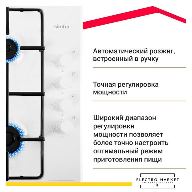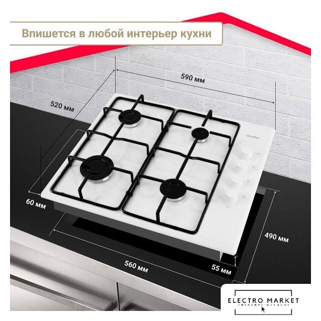 газовая на 4 конфорки, закаленное стекло, мощность: 7500 Вт, автоматический электроподжиг, газ-контроль, решетки: чугун, независимая установка, размеры (ШхГ): 60x51 см