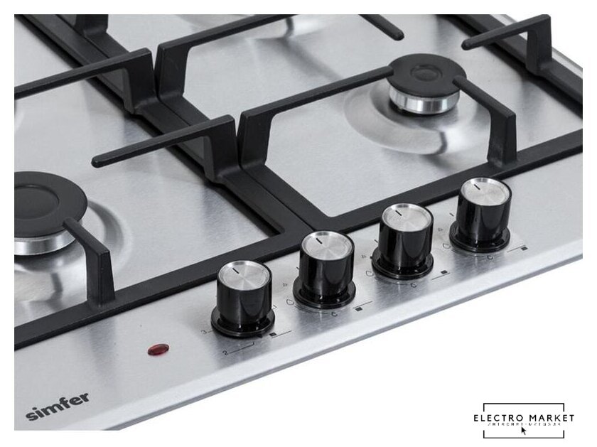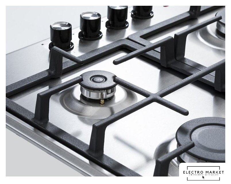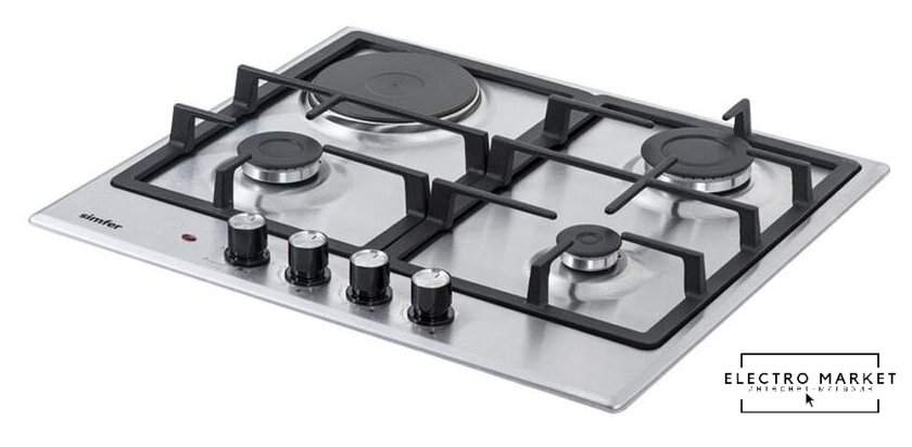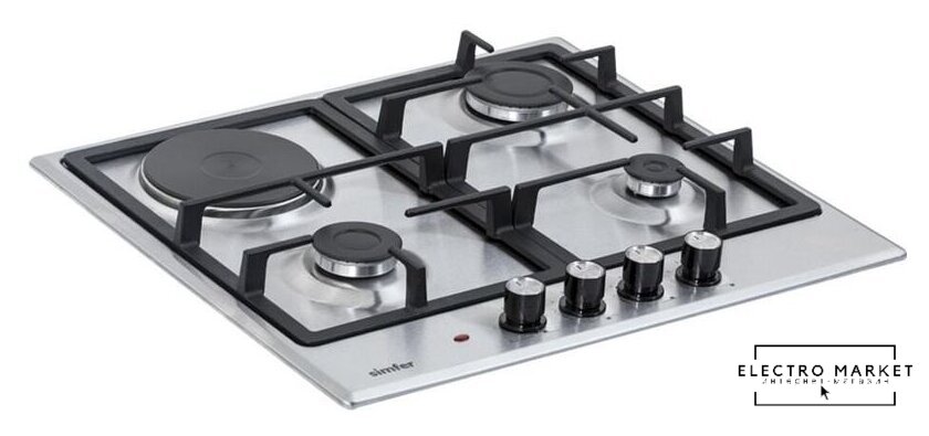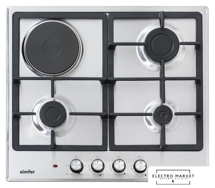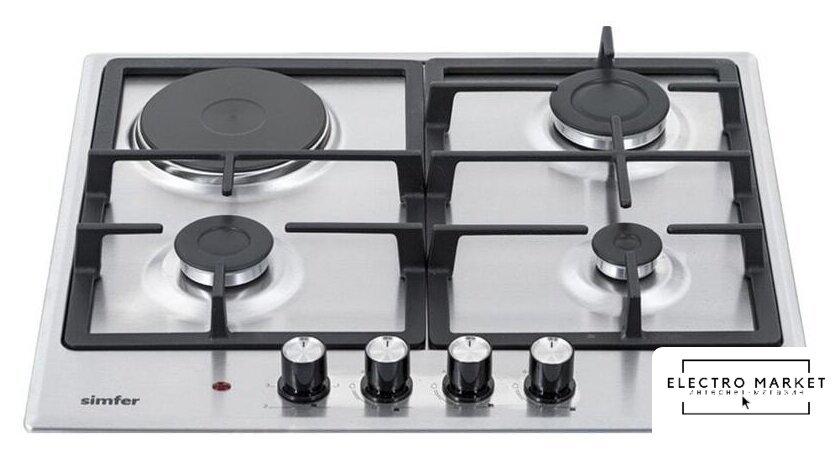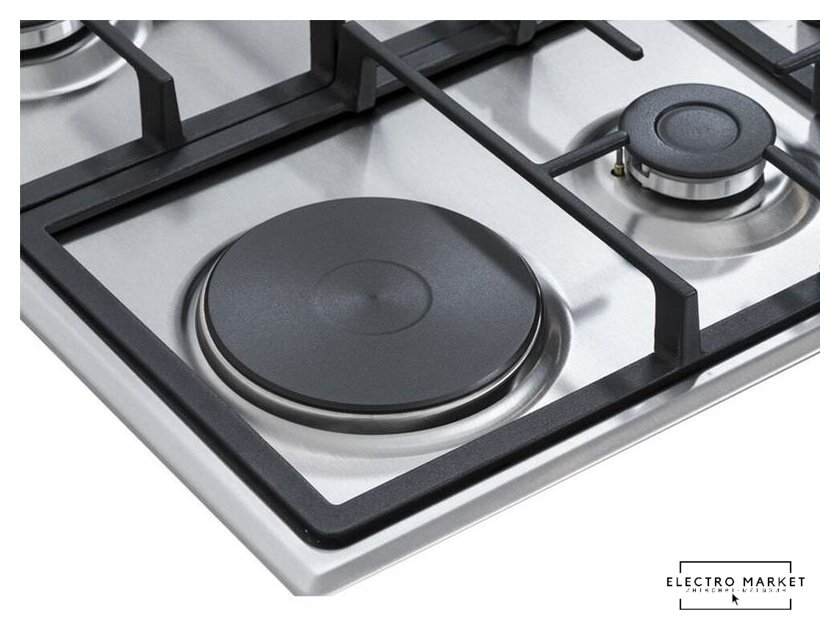 газ+электро на 4 конфорки, нержавеющая сталь, мощность: 7250 Вт, автоматический электроподжиг, газ-контроль, решетки: чугун, независимая установка, размеры (ШхГ): 60x52 см