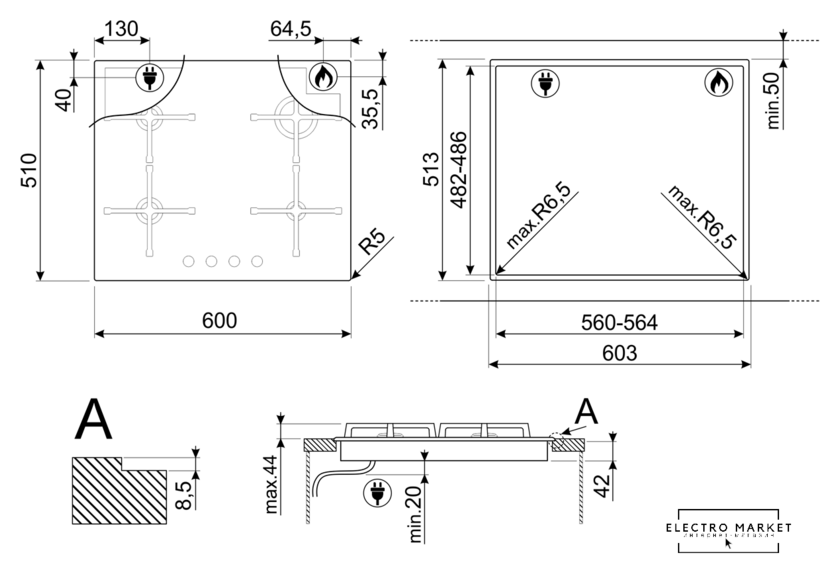 газовая на 5 конфорок, нержавеющая сталь, мощность: 12500 Вт, автоматический электроподжиг, газ-контроль, решетки: чугун, независимая установка, размеры (ШхГ): 91.5x52 см